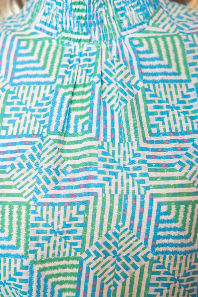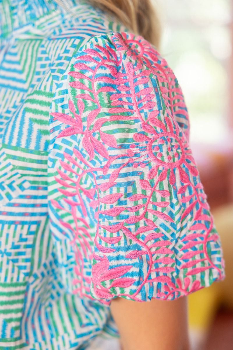 36395 Smocked Mock Neck Embroidered Sleeve Top