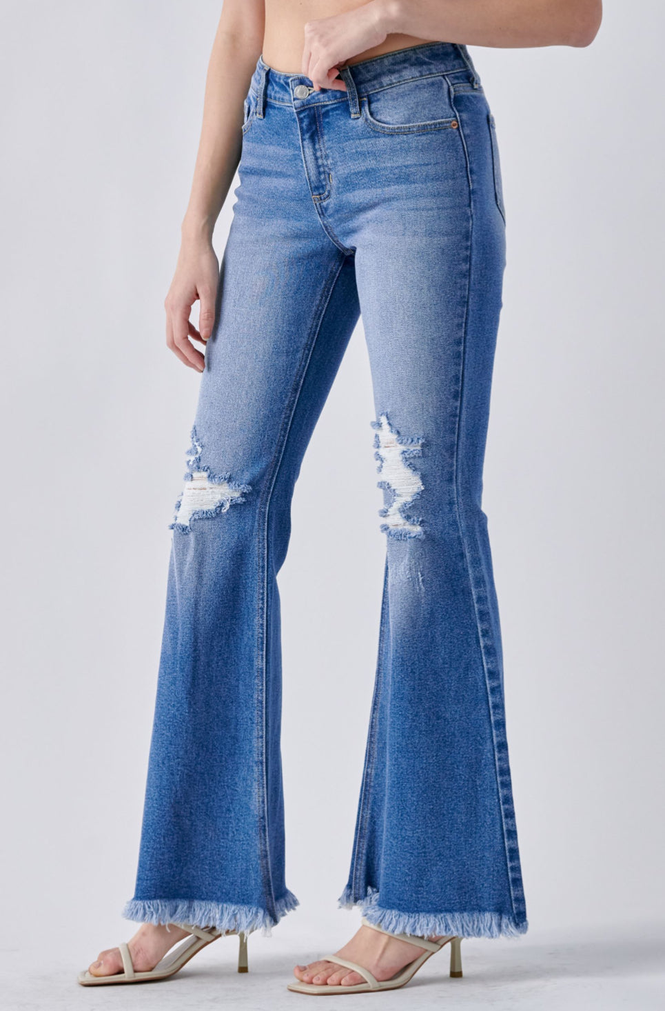 Our super flare jean in a classic light denim wash is cut from premium stretch denim. Subtly faded, it features an elevated waistline, classic five-pocket details, and a fitted leg that breaks at the knee. Additionally equipped with fice pockets, belt loops and a zip fly closure.