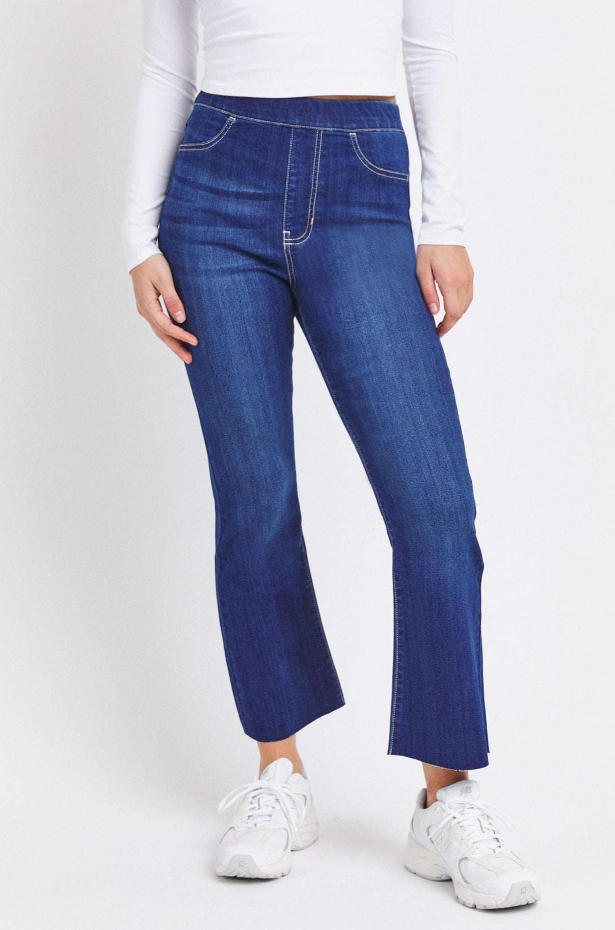 Easy versatile pull-on high-rise jeans featuring a flared cropped hem.