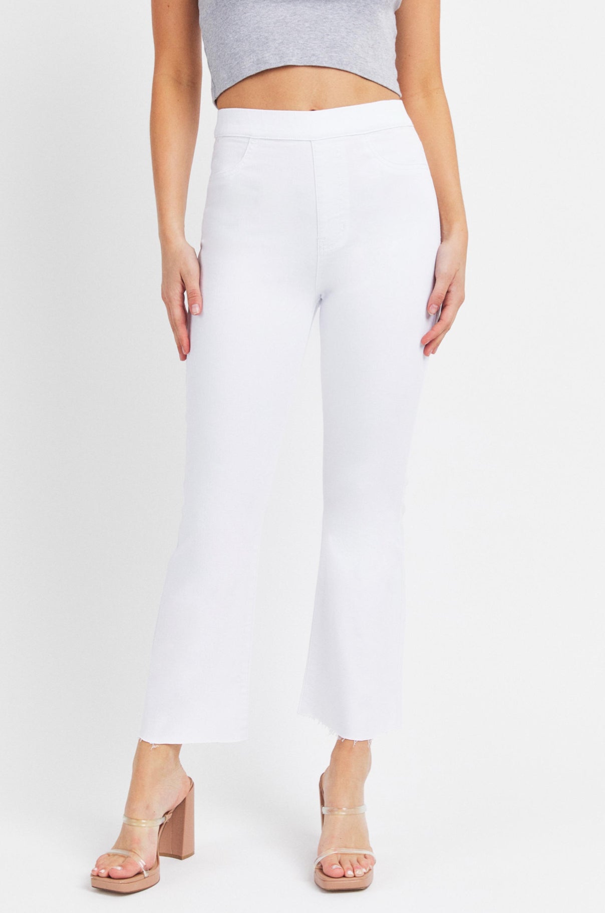 Easy & versatile pull-on high-rise jeans in white denim featuring a flared cropped hem.