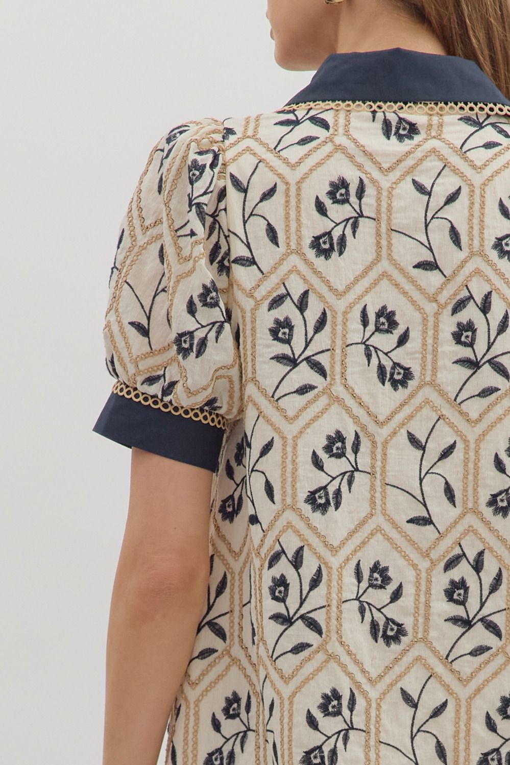 Floral embroidered short sleeve mini dress featuring contrast band and collar button front closure. Side pockets. Lined. Woven. Non-sheer. Lightweight.