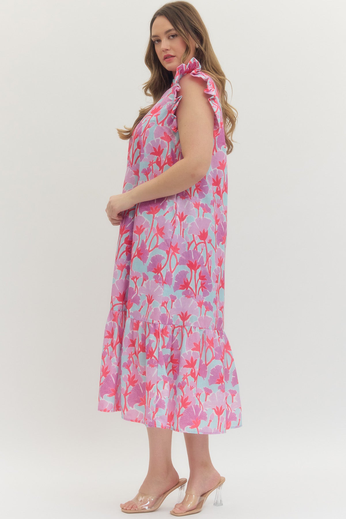 Floral print flutter sleeve midi dress featuring ruffled mock neckline. Button closure at front. Side pockets. Lined. Woven. Non-sheer. Lightweight.