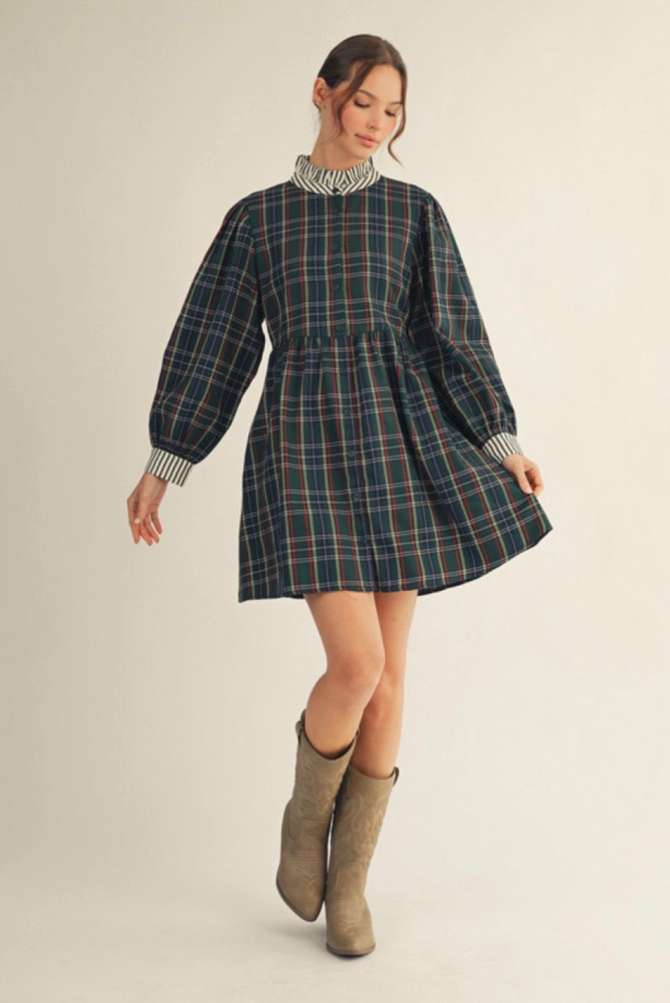 Long sleeves button down plaid dress with stripe contrast, ruffled neckline.