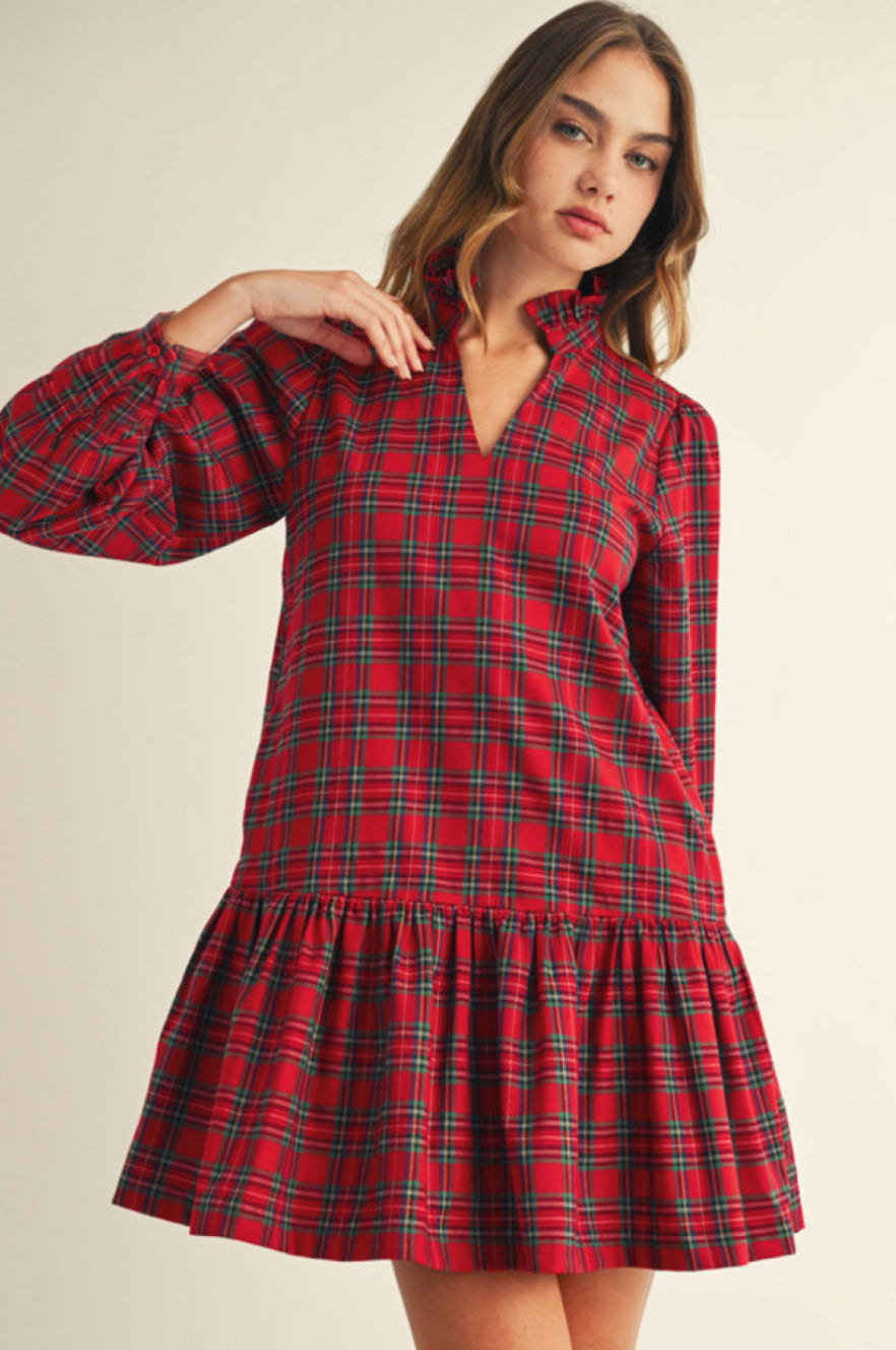 Long sleeves checker dress with side pockets, ruffled high neckline, ruffle hem.