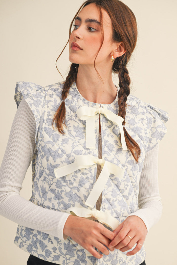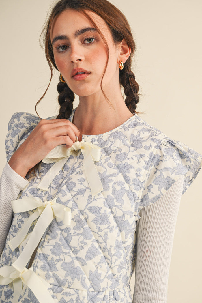 Keep your cold-weather looks whimsical and cute with this flutter sleeve floral quilted vest! Vintage floral print shapes this trendy quilted vest that has a round neckline and a flutter sleeve bodice with triple bow tying closure. A peplum flared hem completes the silhouette.