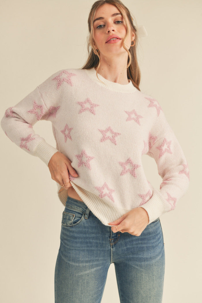 When the nights get chillier and the stars come out, stay cozy and cute in this textured star sweater! Perfectly cozy knit, decorated in fuzzy stars throughout, shapes a crew neckline framed by long sleeves with drop shoulders and fitted cuffs. Relaxed fit bodice keeps you comfy as it falls to a waist-length hem. Ribbed knit accents the neck, cuffs, and hem.