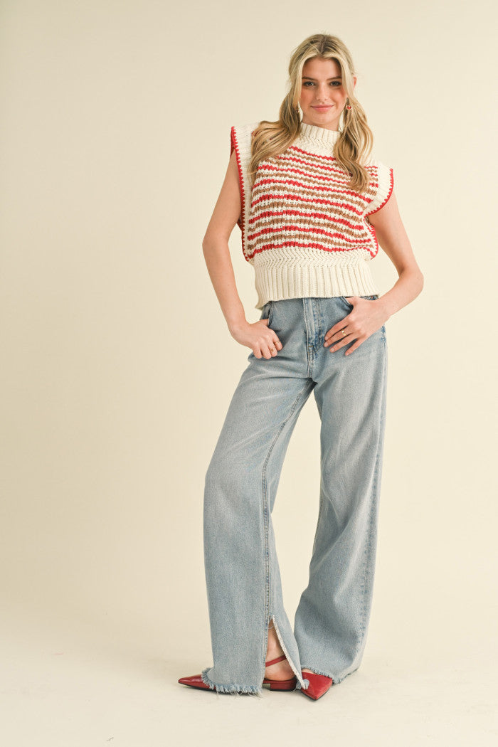 The compliments won’t end when you’re wearing this adorable mock neck sweater vest! Thick sweater knit shapes this darling vest that boasts contrasting colorful knit across its relaxed silhouette. Scallop trim details the sleeveless bodice that supports a ribbed mock neck before falling to a semi-cropped length with a banded ribbed hem hem. Layer with your favorite basic long sleeve top or wear on its own for an on-trend look!