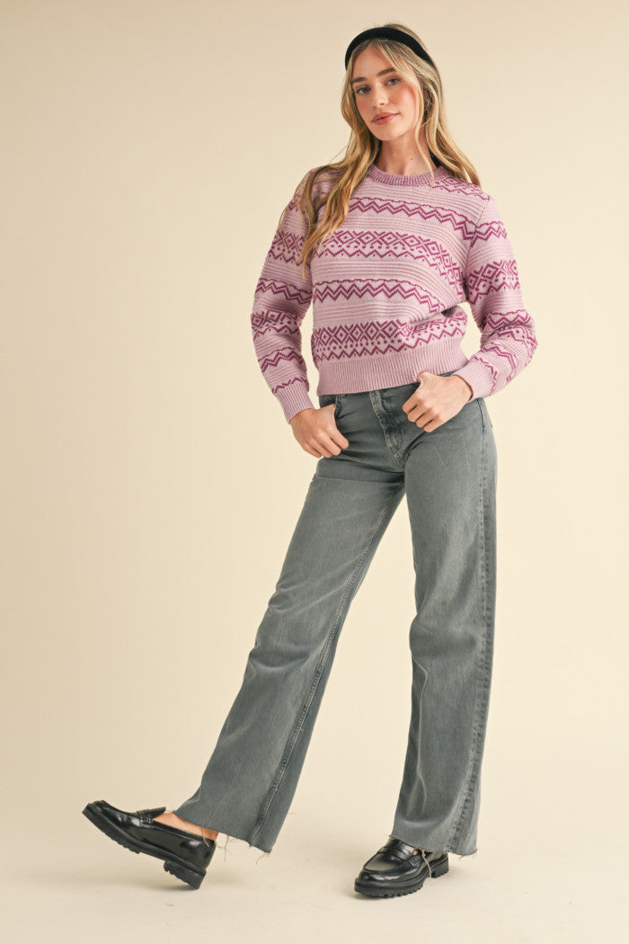 Transitioning into colder weather and still looking cute is easy to achieve when you have this geometric striped sweater! Cozy sweater knit, in striped rows of geometric knit patterns, shapes this essential sweater that has a contrast ribbed knit round neckline framed by long sleeves. Ribbed knit accents the neckline, cuffs, and hem.