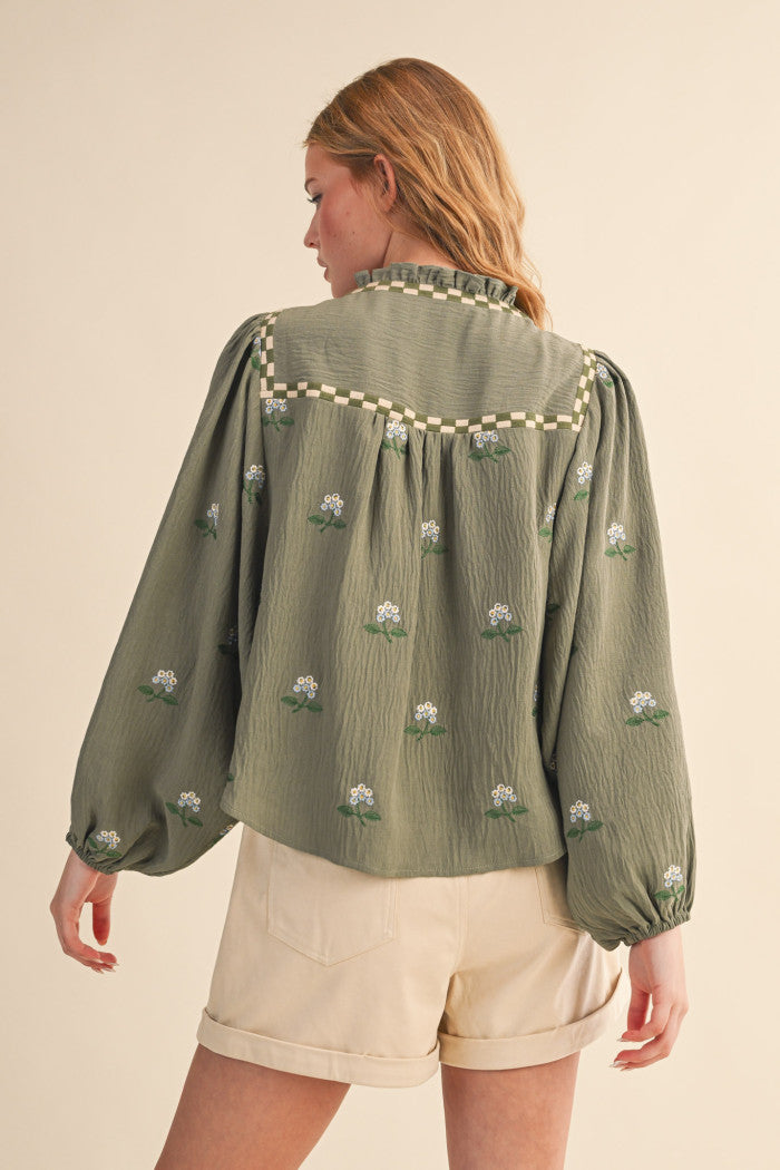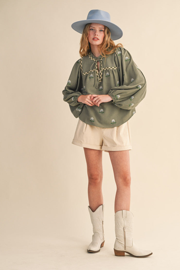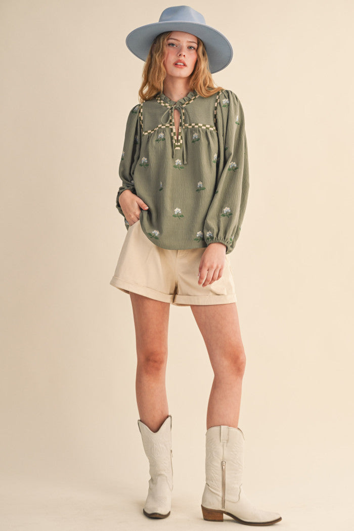 Grab some boho bottoms and chic ankle boots to pair with this floral embroidered babydoll top! Woven fabric, with floral embroidery throughout, shapes this top with a ruffled neckline, keyhole opening, and tying detail. Long balloon sleeves with elastic cuffs frame this babydoll bodice. Contrast checkered embroidery on the neckline and yoke.