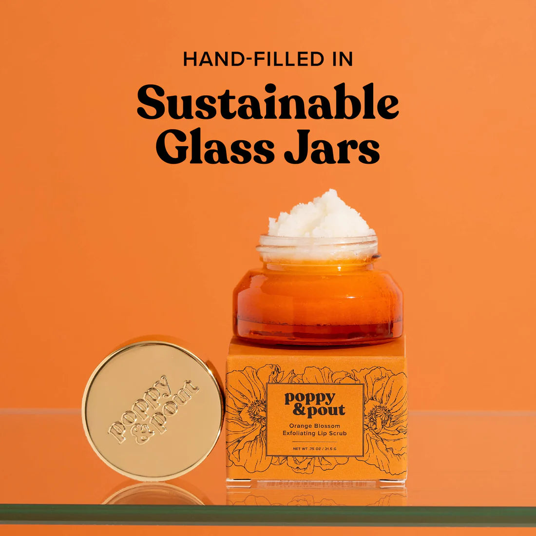 Poppy & Pout's Exfoliating Lip Scrubs are the perfect way to prep your pout for smooth, hydrated lip balm application. We use a clean combination of natural ingredients to help clean and gently exfoliate your lips. Our Orange Blossom lip balm tastes exactly like biting into a delicious orange creamsicle!