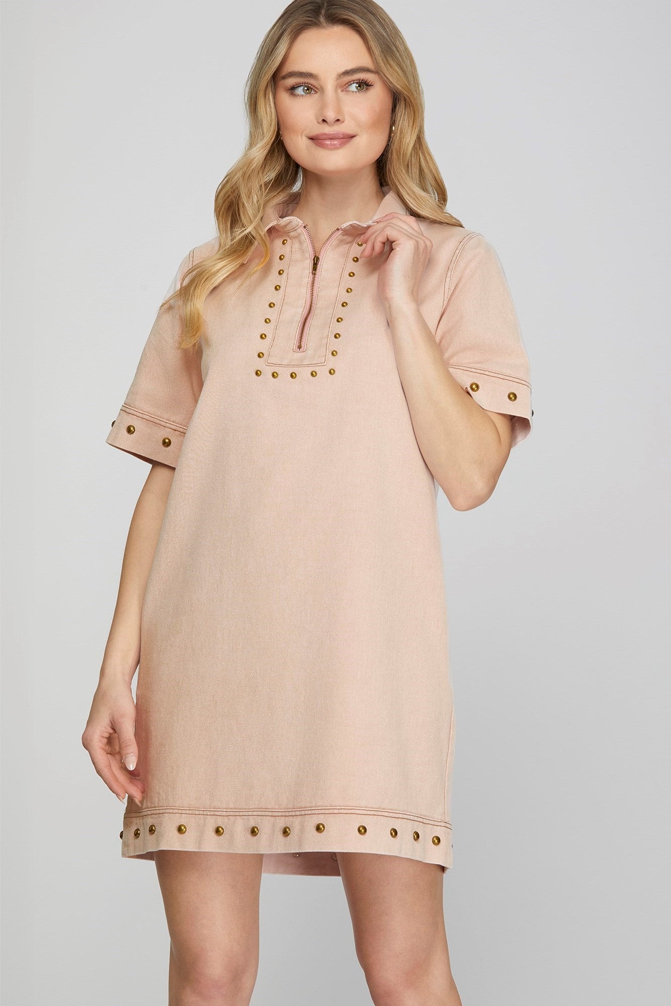 SHORT SLEEVE 1/2 ZIP STUDED WASHED MINI DRESS WITH POCKETS