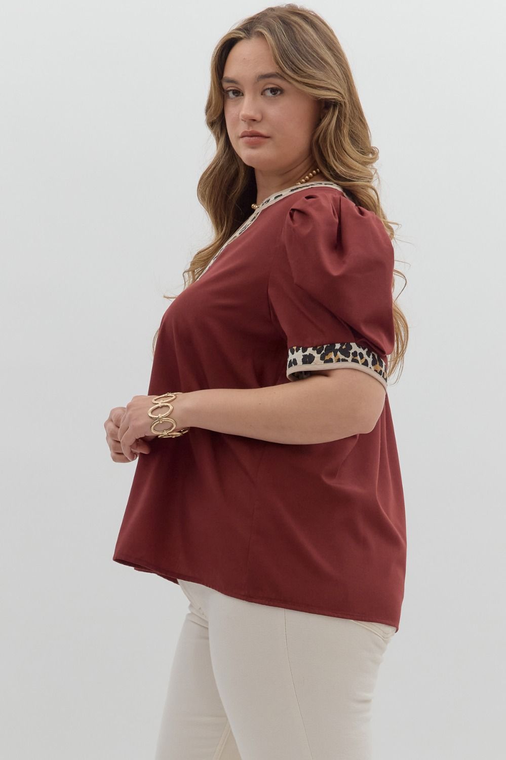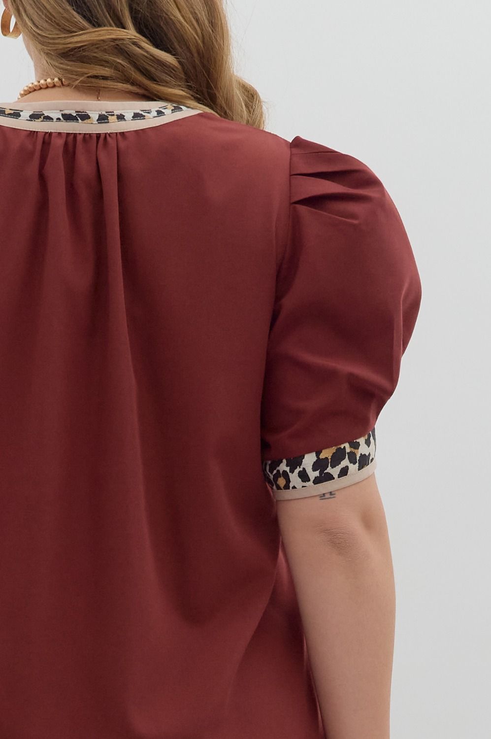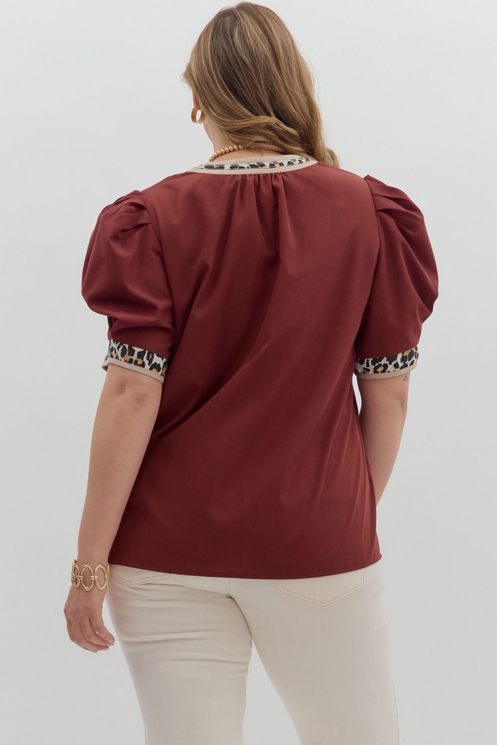 Solid pleated short voluminous sleeve pullover top featuring accented leopard print split v-neck and band. Unlined. Woven. Semi-sheer. LIghtweight.