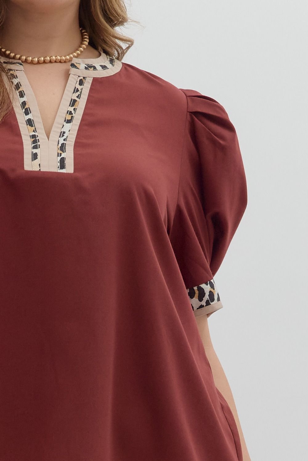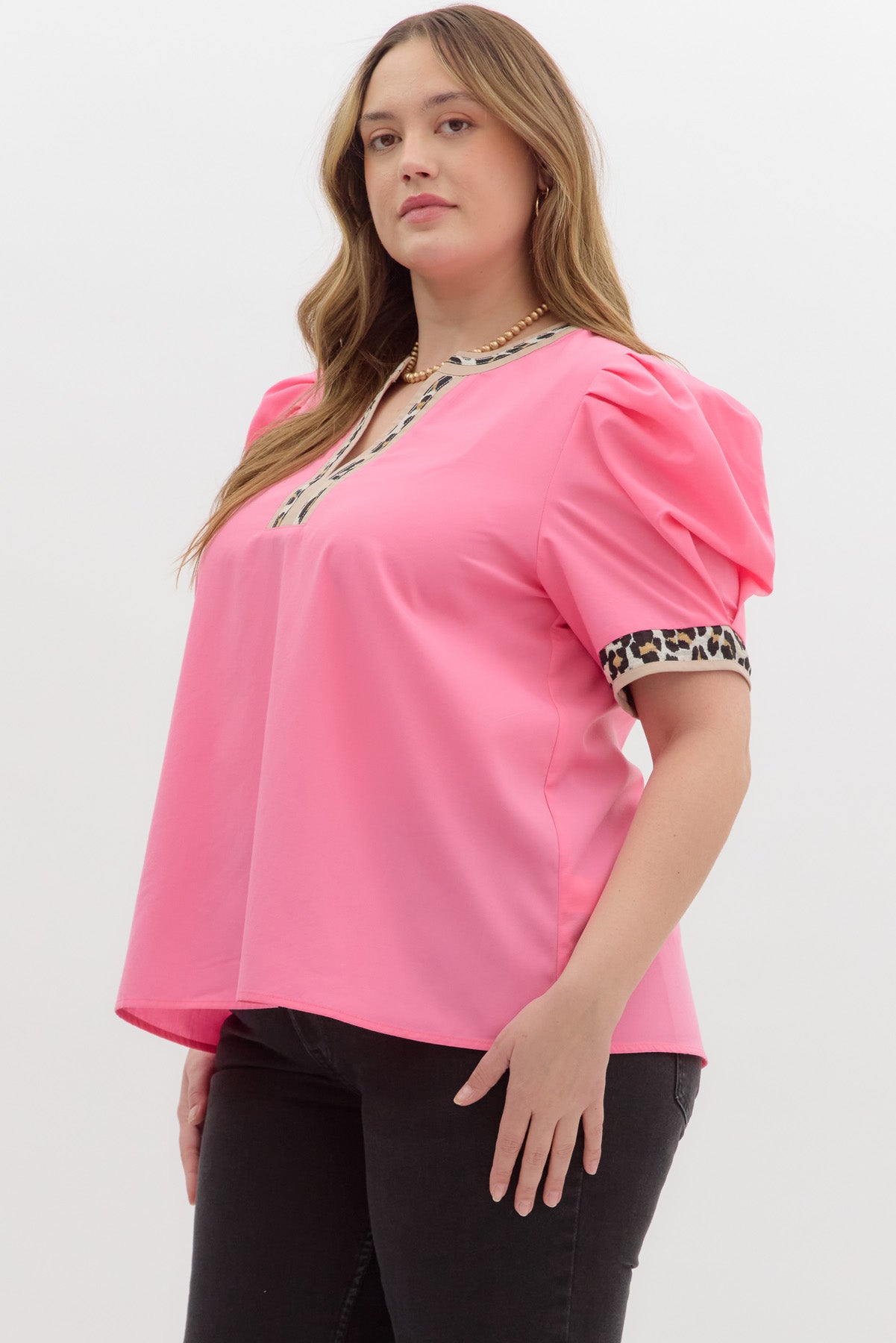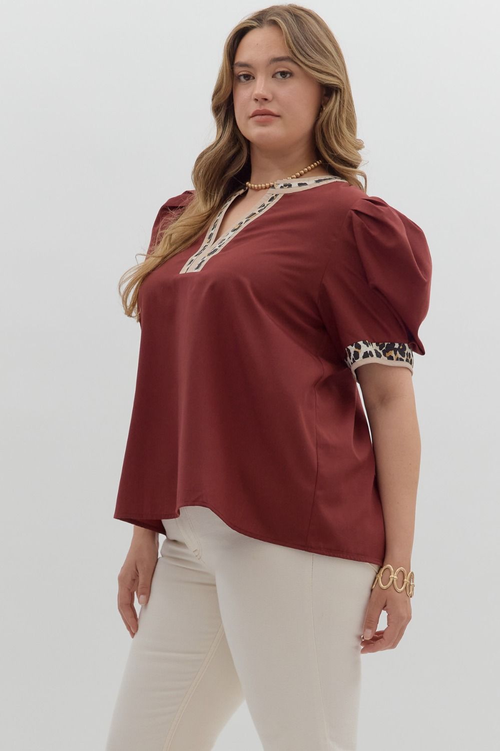 Solid pleated short voluminous sleeve pullover top featuring accented leopard print split v-neck and band. Unlined. Woven. Semi-sheer. LIghtweight.