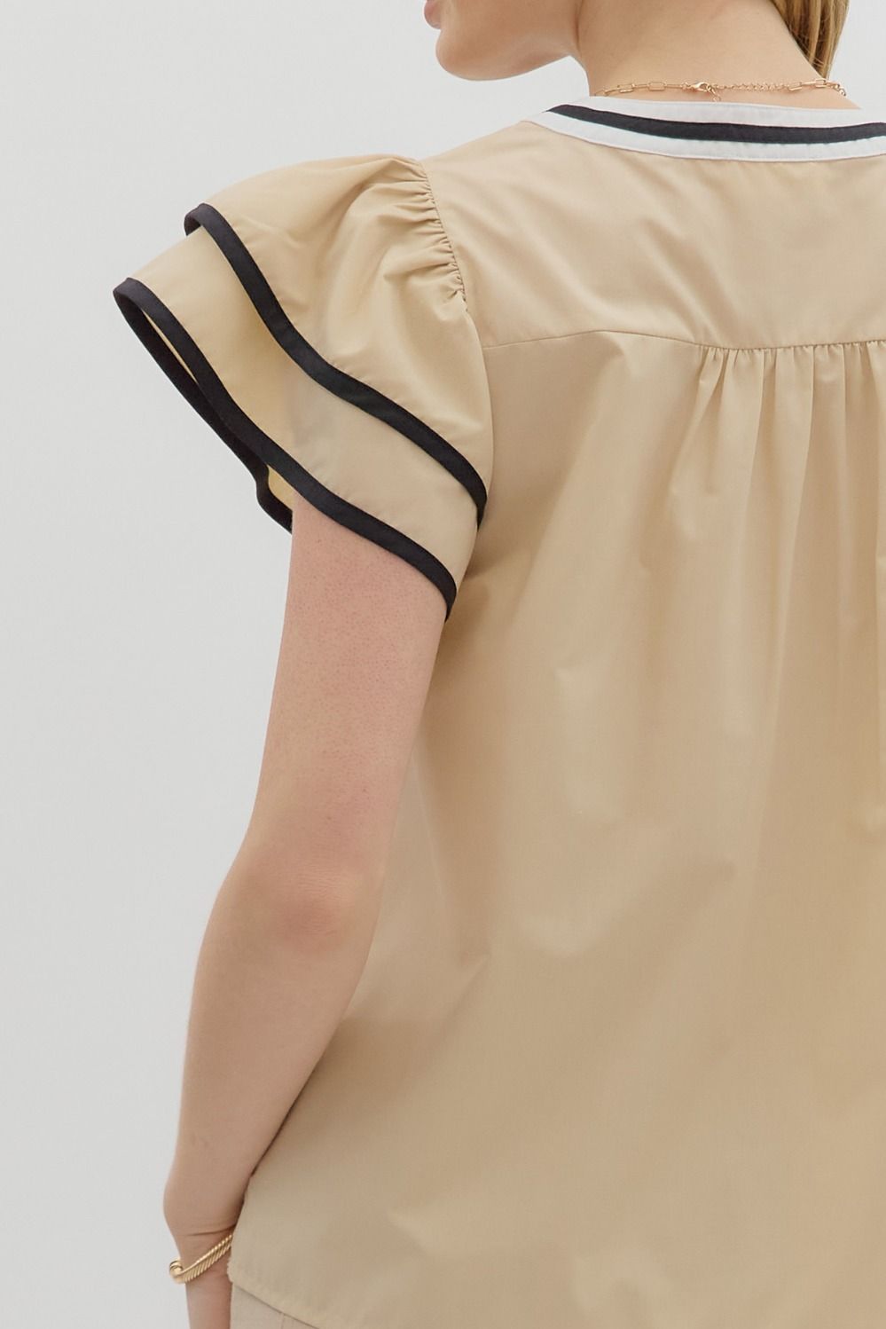 Solid flutter sleeve mutlicolor accent V-neck top featuring embroidered applique at front. Unlined. Woven. Non-sheer. Lightweight.