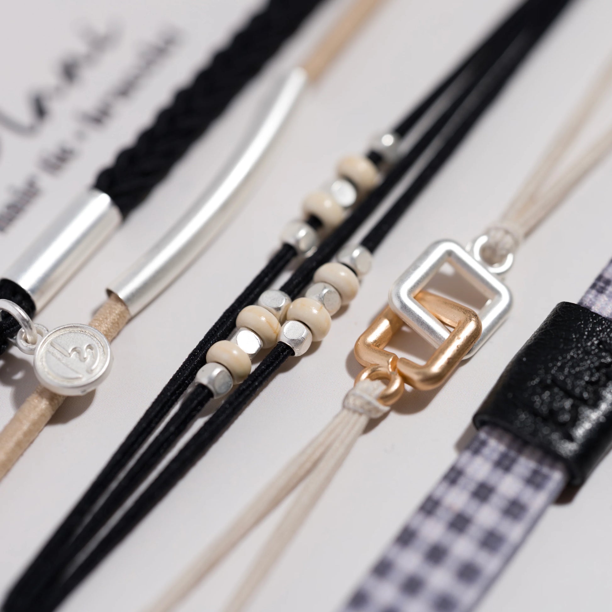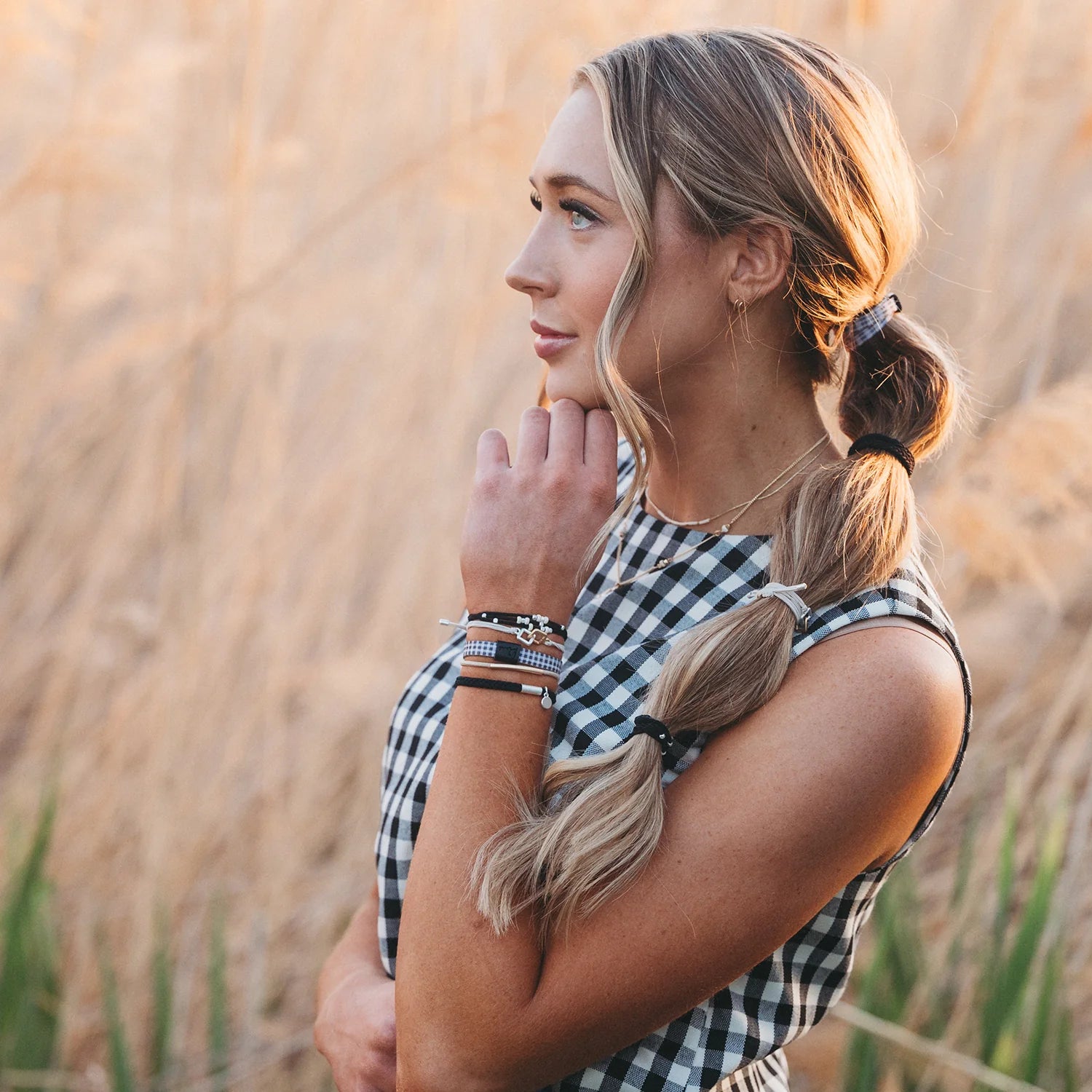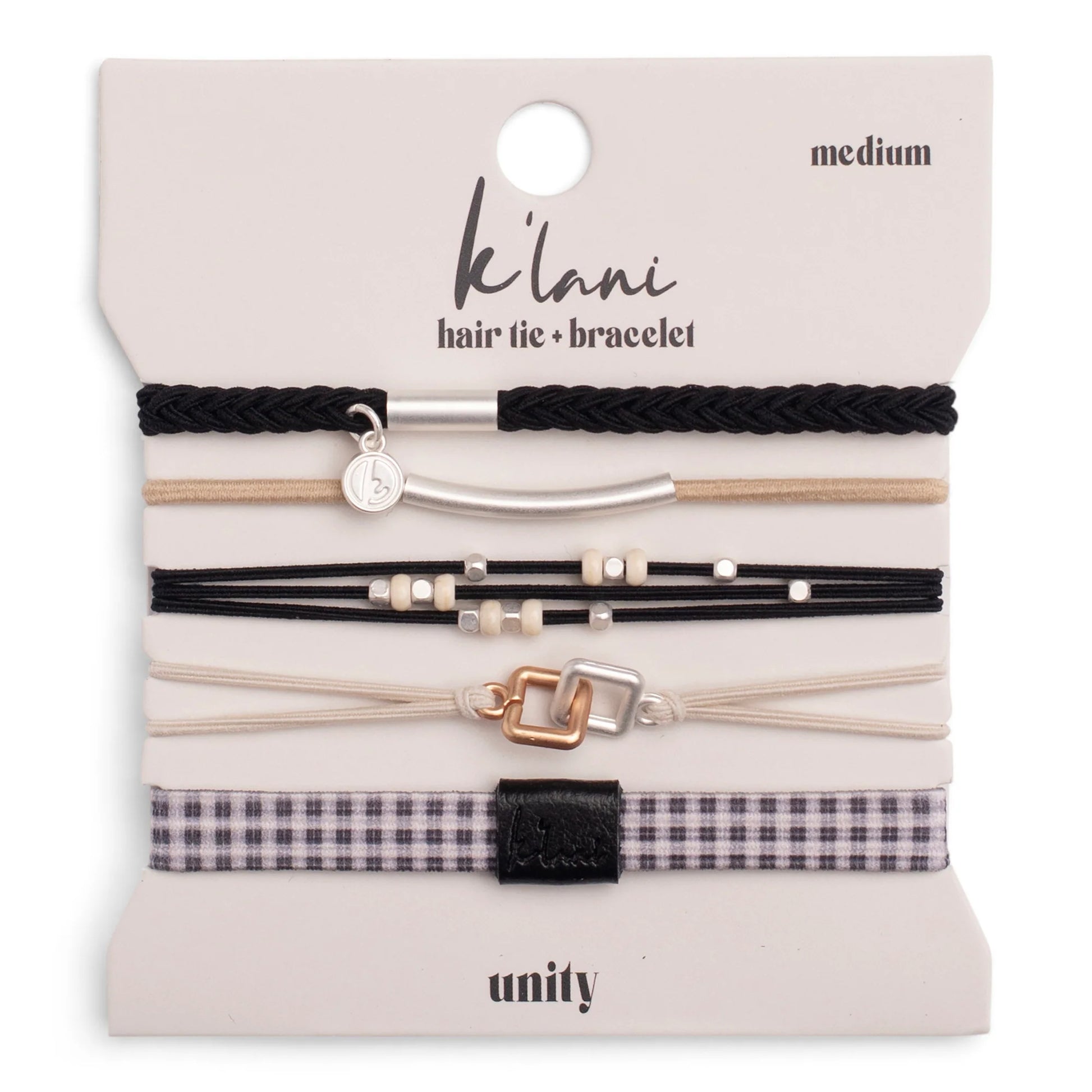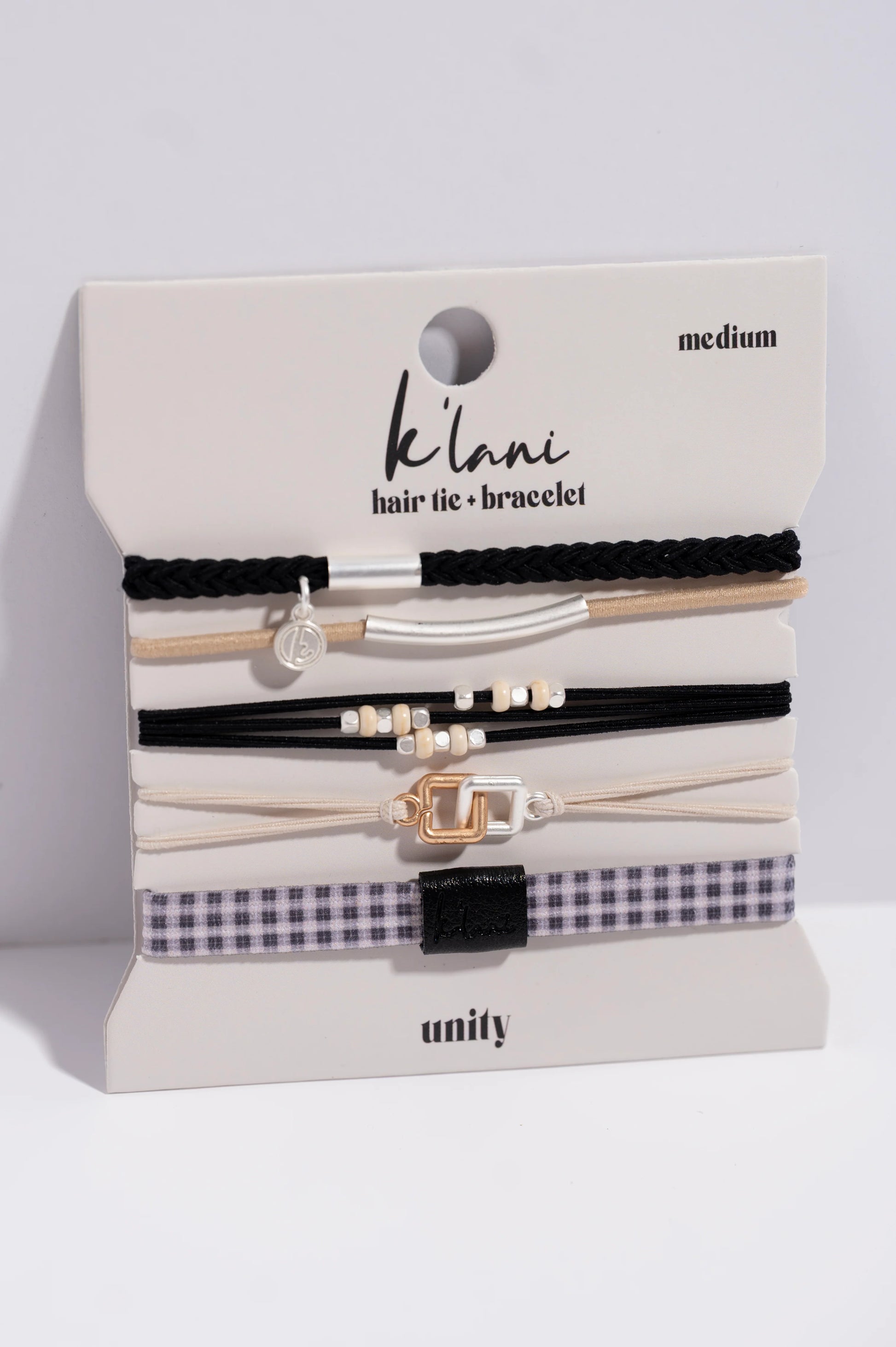 Our Unity set symbolizes connection and strength in togetherness. These 5 hair tie bracelets feature a timeless mix of black and tan tones, accented with silver and cream stone beads. A standout black and cream plaid band adds classic charm, while the gold and silver interlocking square charms represent harmony in diversity. This set is a beautiful reminder that we’re stronger when we stand united.